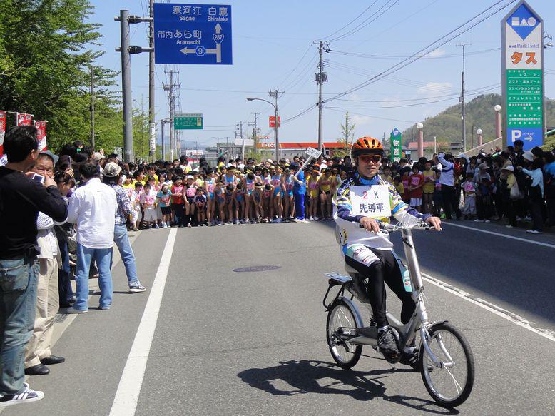 避難所に到着、本部にあいさつして「AKB48」「山形県自転車組合青年部」