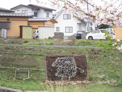 見て下さい。山形市小立を流れる「龍山川」堤防に、「きてけろくん」がやってきましたよ。お土産は、な、なんと世界一美味しい「サクランボ」だよ、たまんなえな。(笑) すごいコラボでしょう。今年の植栽の目玉アートです。デザインは、専門家の芸工大生(メンバーですよ)3名で作成してくれたんだから、もう最高に素敵!!小立大橋は、「滝小、六中生の通学路」なので、朝晩談笑ながら賑やかに通ります。ドライバーさんも見とれて、「危ないよ〜〜」。あと3〜4日すれば、花文字も咲いて、見事なそろい踏みですなーどうぞ、見に来てけらっしゃいな。o(^-^)o
