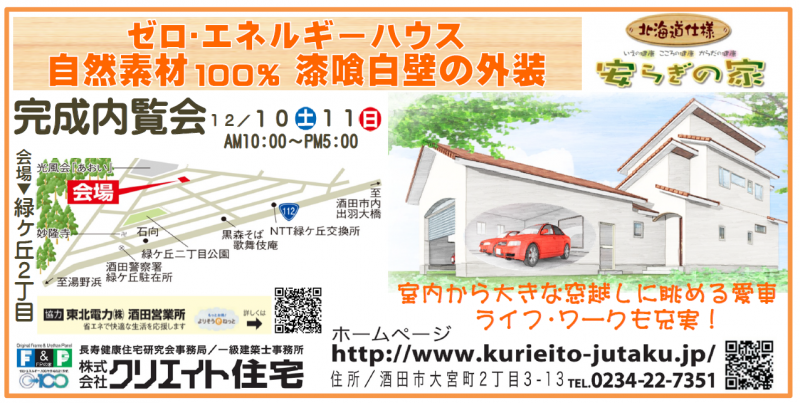 株式会社クリエイト住宅では、12月10日(土)・11日(日)の2日間、完成内覧会を開催します。 スタッフ一同、お客様のお越しを心よりお待ちしております。