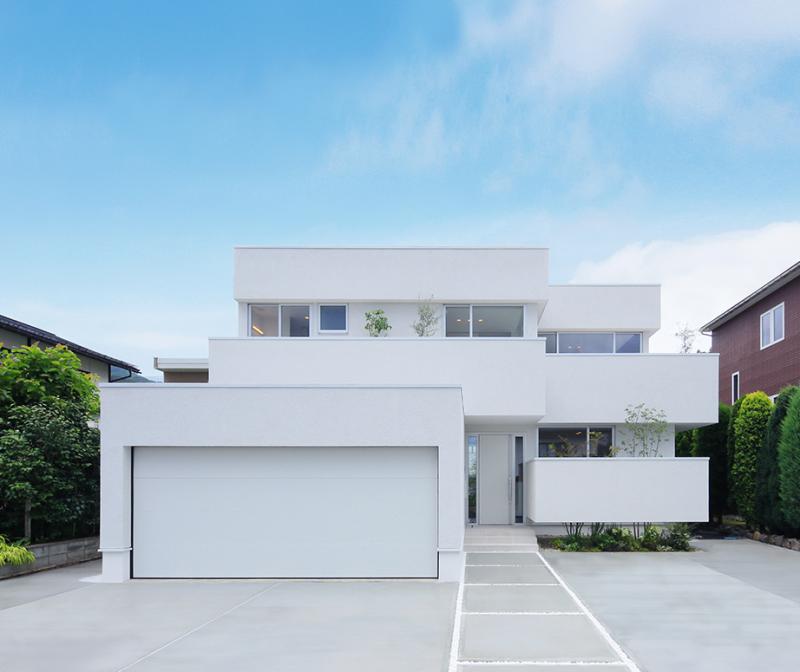 KES構法ならではの「浮遊する壁」と水平ラインが美しい。軽快な外観が特徴的な、シンプルモダンの邸宅。2階リビングではバイオエタノール暖炉と石張りの壁が、ラグジュアリーで非日常的な空間をつくり出します。また大開口のサッシによって広々としたオープンバルコニーと室内が一体的に繋がり、開放的な暮らしを愉しめます。