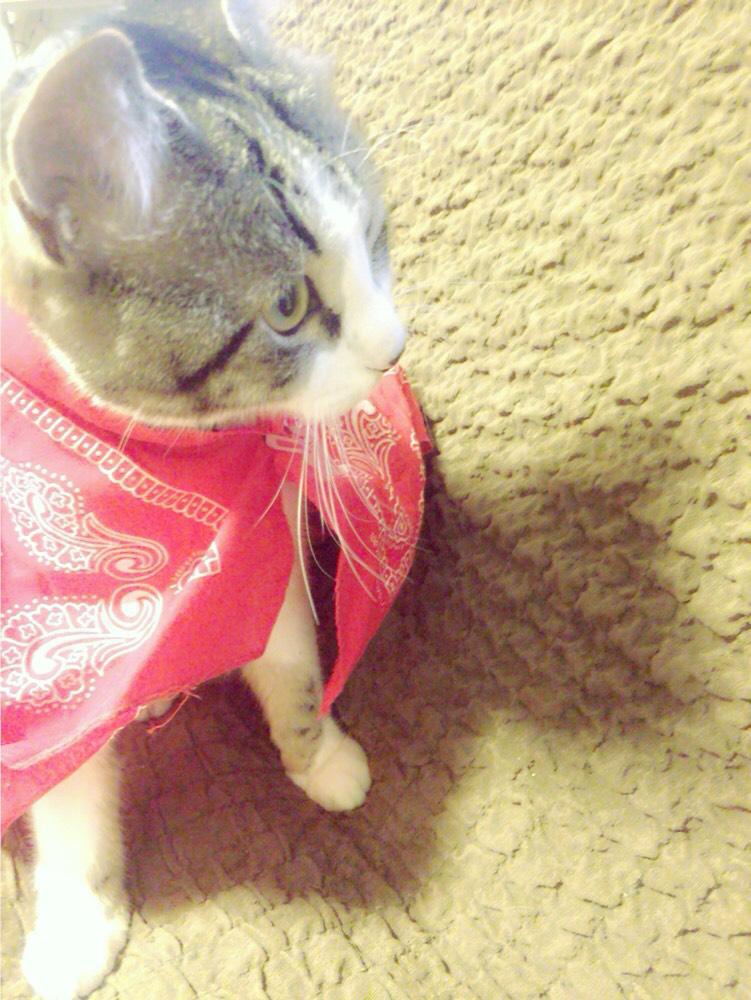 今回は私のペットを紹介します 名前は「ハル」です! H27年3月に生まれました! 今は1歳10か月です! 性格はとてもわんぱくで、ネコなのに私や父にベタベタくっついてきます! この写真は、ハルにバンダナをつけてヒーローごっこをした時の写真です^^ ぜひ、みなさんもネコを飼ってみてください!とても癒されます