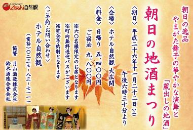 自然環境が豊な朝日町。その中で造られた日本酒は地域に愛される朝日の逸品。恒例となりました「朝日の地酒まつり」を開催いたします。「銀嶺月山」や「豊龍」の酒蔵として知られる江戸期創業の歴史ある鈴木酒造で丁寧に造られた蔵出しの地酒を思う存分ご堪能ください。やまがた舞子の華やかな演舞とともに、美味しいお酒をお楽しみください。◇日時 平成26年11月22日(土) 午後6:30から◇場所 ホテル自然観 大広間◇料金 宿泊9,800円 日帰り5,400円※定員(60名)になりしだい受付を終了いたしますので、お早めにお申込みください。 お電話でのお申し込み・お問い合せは…tel.0237-83-7111 (Asahi自然館)→Asahi自然館のホームページからもお申込みできます。