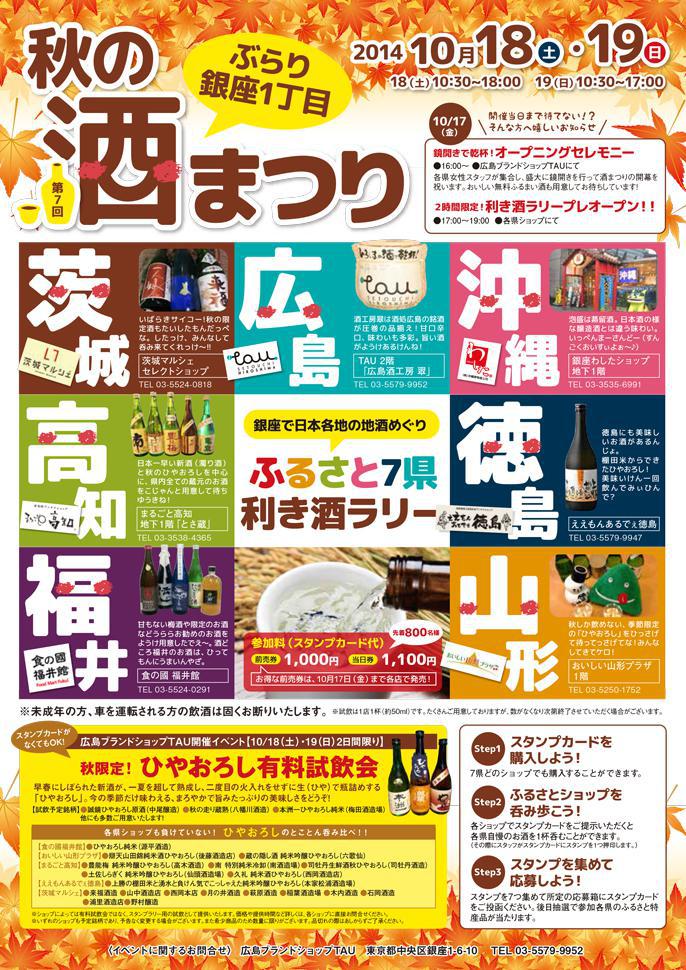 10月18日(土)・19日(日)、東京・銀座1丁目にある7県のふるさとショップを巡り各県のお酒を楽しむ「ぶらり銀座1丁目・秋の酒まつり」が開催されました。 銀座1丁目は、山形県「おいしい山形プラザ」の他にも、広島、茨城、高知、福井、沖縄、徳島のアンテナショップが軒を連ねるふるさとショップ激戦区!広島県の呼びかけにより、広島・山形・高知・沖縄の4県の連携でスタートしたこのイベントも、茨城、福井、徳島が加わり7県に拡大。今回で7回目の開催となりました。 今回の「ぶらり銀座1丁目 第7回 秋の酒まつり」では、スタンプカードを購入した参加者は、7県のふるさとショップで各県自慢の銘酒を1杯ずつ試飲でき、さらにお酒に合う各県名産のおつまみの試食も!さらにさらに! スタンプを7つ集めると、後日抽選で参加各県のふるさと特産品が当たるおいしい&うれしい企画です! 「開催当日まで待てない!」10/17(金)には、そんな方向けに「2時間限定! 利き酒ラリープレオープン!」が開催され、プレイベントにも関わらずおいしい山形プラザは多くの方で賑わいました。 ▲山形自慢の銘酒がズラリ! ▲コップいっぱいに注がれる黄金色の銘酒「山吹極」 ▲山形県産酒で乾杯! ▲お酒と一緒に振る舞われた、山形名産「玉こんにゃく」も大人気! 一通りスタンプラリーを終えたあとに、「もう一度山形のお酒が飲みたい!」「日本酒と玉こんにゃくって合うね〜!」…と戻ってきてくださる方もおり、大盛況のままプレオープンは幕を下ろしました。 「ぶらり銀座1丁目・◯の酒まつり」は、季節を変えて今後も開催される予定です。のんびり銀座を歩きながら、日本各地の地酒&肴が楽しめるお得な利き酒ラリー。次回の開催も、ぜひお楽しみにお待ちください! そして皆様! 乾杯は県産酒で!