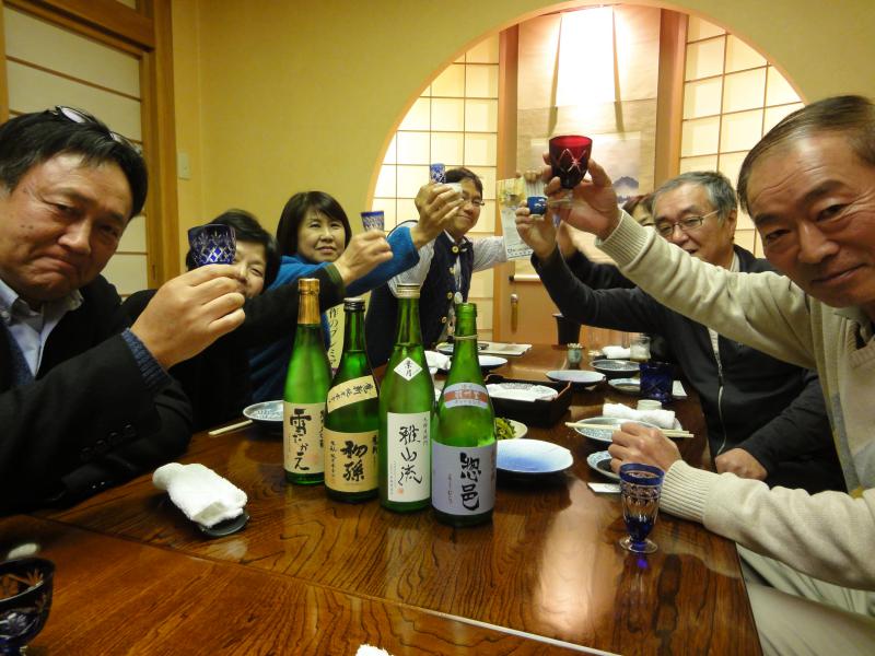 ▼お名前(ニックネーム)まもちん▼写真に写っている県産酒名惣邑・雅山流・初孫・雪むかえ▼ひと言とあるイベントで夫婦3組を連れてお店を「はしご」しました。写真は、長井市の「鮨と季節の味きらく」にて。写真ではよく見えませんが、左側の一番後ろの人は、「乾杯は県産酒で!」というクリアファイルを持っています。