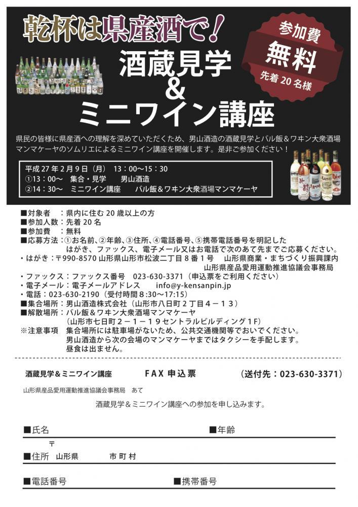 県民の皆様に県産酒への理解を深めていただくため、「男山酒造の酒蔵見学」と「バル飯&ワヰン大衆酒場マンマケーヤのソムリエ_によるミニワイン講座を開催します。是非ご参加ください!■対象者 :県内に住む20歳以上の方■参加人数:先着20名■参加費 :無料■応募方法:@お名前、A年齢、B住所、C電話番号、D携帯電話番号を明記したはがき、ファックス、電子メール又はお電話で次のあて先までご応募ください。●はがき:〒990-8570山形県山形市松波二丁目8番1号 山形県商業・まちづくり振興課内山形県産品愛用運動推進協議会事務局●ファックス:ファックス番号 023-630-3371(申込票をご利用ください)●電子メール:電子メールアドレス info@y-kensanpin.jp●電話:023-630-2190(受付時間8:30〜17:15)■集合場所:男山酒造株式会社(山形市八日町2丁目4−13)■解散場所:バル飯&ワヰン大衆酒場マンマケーヤ(山形市七日町2−1−19セントラルビルディング1F)※注意事項 集合場所には駐車場がないため、公共交通機関等でおいでください。男山酒造から次の会場のマンマケーヤまではタクシーを手配します。昼食は出ません。