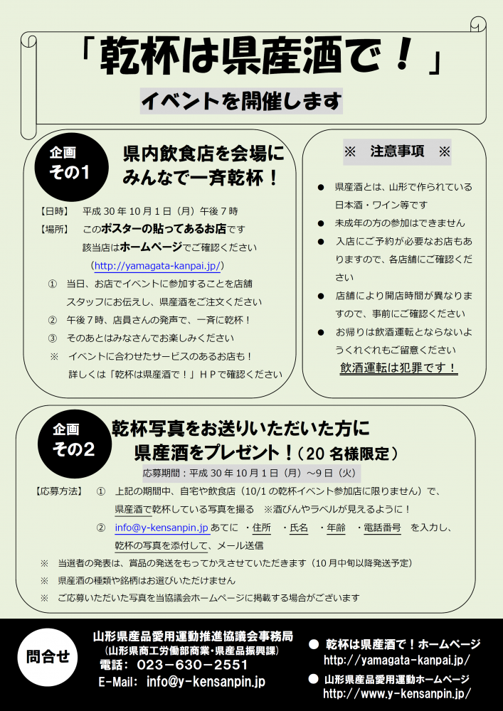 10月1日はおいしい山形県産酒で乾杯!県内飲食店を会場に、県内一斉乾杯を実施します!会場はこのポスターの貼ってあるお店です。さらに、乾杯写真をお送りいただいた方に県産酒をプレゼントする企画もあります。【受付期間:10/1(月)〜9日(火)】ぜひ皆さんご参加ください!