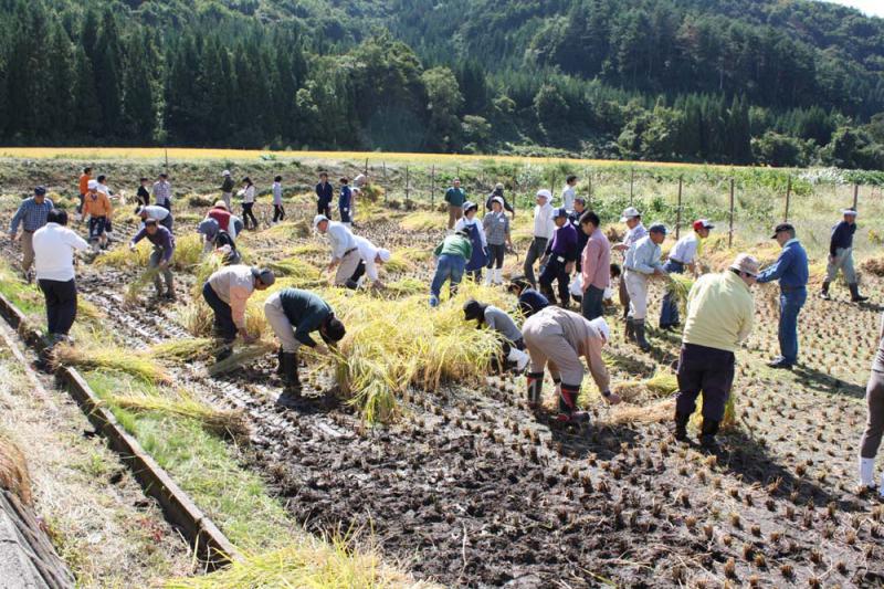 「一般のお客様を迎えて、5月の祭で田植えを行った田んぼの稲刈りをする」