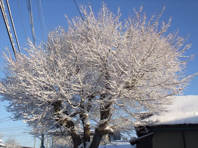 ずです。しかし、今朝は真っ青な青空です。昨夜降った粉雪に朝日がさし