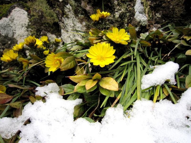 雪がまだ残っています。雪の中の福寿草の黄色が